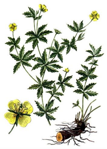 Прямостоячая лапчатка или калган (узик; potentilla erecta, potentilla tormentilla). Рисунок.