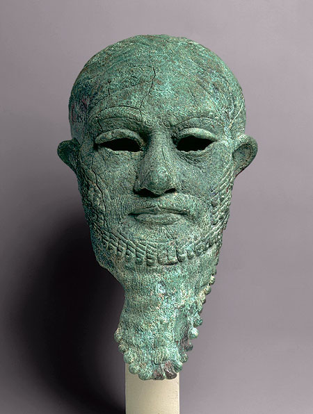 Голова сановника. Полая внутри голова снабжена штырем, распоженным у основания шеи, возможно служившим для ее крепления к телу. Бронза. Около 2300-2000 гг. до н.э. Иран.