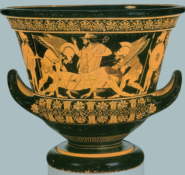Краснофигурный килик-кратер с изображением эпизода из «Элиады» Гомера: перенесение тела принца Ликии Сарпедона, погибшего в схватке с другом Ахилла Патроклом. Гипнос (Сон) — слева и Танатос (Смерть) — справа под покровительством Гермеса несут тело героя на его родину для погребения. Наверху кратера есть подписи вазописца Евфрония и гончара Эвксития. Терракота. Древняя Греция. Ок. 515 г. до н.э.