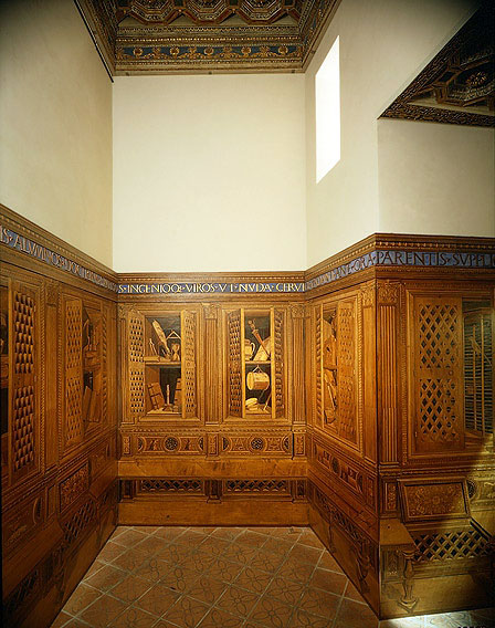 Фрагмент реконструированного кабинета Федерико да Монтефельтро во дворце Губбио. Инкрустированные орех, розовое дерево, дуб и древесина фруктовых деревьев на основе ореха. Автор эскизов предположительно Франческо ди Джоржио Мартини. Италия, 1479-1482 гг.