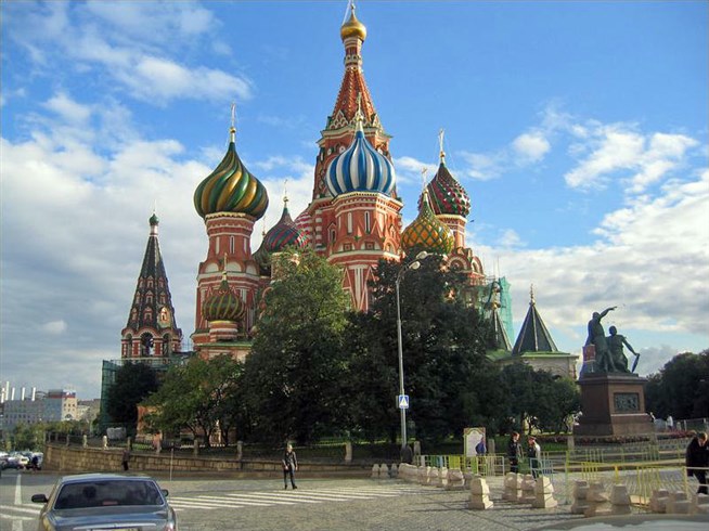 Храм Василия Блаженного. Один из самых известных храмов Москвы, построен под названием Покровский собор в 1555-61 в честь победы над Казанским ханством в праздник Покрова Богородицы. Впоследствии пристроенная церковь Василия Блаженного дала название всему храму. Пестрая раскраска отражает вкусы позднейшего времени (17 век). Первоначально храм был окрашен в красную и белую краски. Покровский собор задумывался как первый общегородской собор, построенный вне стен Кремля, и должен был символизировать единение царя с народом.