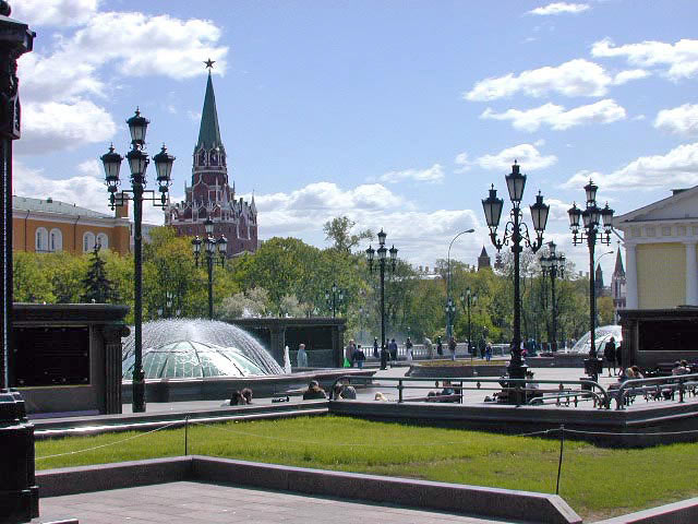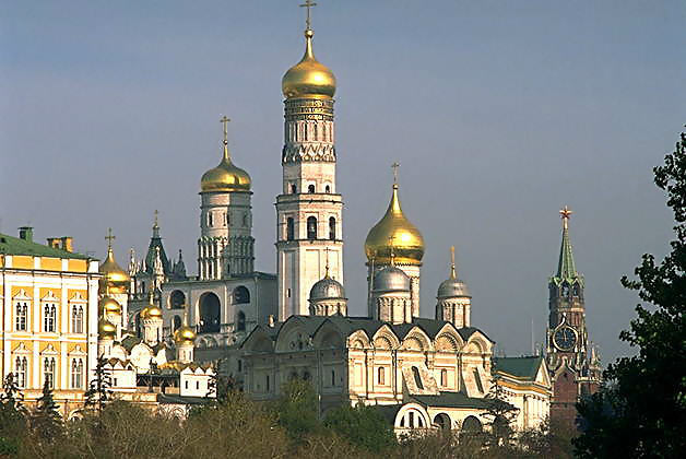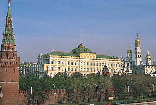 Большой Кремлевский дворец. До 1917 — московская резиденция российских императоров, место парадных приемов. Построен в 1839-49 К. А. Тоном при участи других архитекторов. В плане имеет вид каре с внутренним прямоугольным двором. Фасады выполнены в «русско-византийском» стиле, интерьеры — эклектика. В первом этаже 2-этажного здания (второй этаж 2-ярусный) находятся бывшие личные покои российских императоров — анфилада парадных комнат, отделанных мрамором, малахитом, украшенных лепниной, росписью, скульптурой, изделиями из бронзы и фарфора, обставленных резной позолоченной мебелью 19 в. На втором этаже — парадные залы: Георгиевский, Владимирский и Екатерининский и другие помещения. В 1999 во дворце закончена реставрация, убравшая позднейшие советские наслоения.