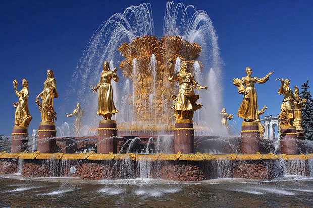 Фонтан «Дружба народов». Всероссийский выставочный центр (бывшая ВДНХ). 15 женских фигур (1954; архитекторы К. Т. Топуридзе, Г. Д. Константиновский; скульпторы И. М. Чайков, З. В. Баженова, П. И. Добрынин и др.) символизируют 15 республик СССР. Фигуры фонтана (покрытые настоящим сусальным золотом!) играли заметную роль в фольклоре советского времени.