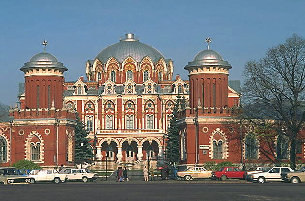 Петровский дворец (Петровский замок, Путевой дворец или, правильнее, Подъездной дворец). Вид со стороны заднего фасада. Построен в 1776-96 архитектором М. Ф. Казаковым на месте сельца Петровское (бывшее владение Высокопетровского монастыря, где был небольшой путевой домик Петра I). Квадратное в плане здание дворца увенчано куполом, охваченным стрельчатыми арками-кокошниками, и окружено массивной стеной с башнями. Классицистическая в своей основе композиция сочетается здесь с древнерусскими и ложноготическими архитектурными деталями. В 1827 при дворце был разбит парк. В 1812 здесь останавливался Наполеон, после революции — размещалась Военно-воздушная инженерная академия им. Н. Е. Жуковского (доступ в здание в это время был строго ограничен). В конце 1990-х гг. здание передано мэрии Москвы.