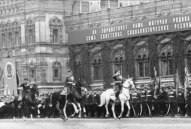 Парад Победы. Маршалы Советского Союза Г.К. Жуков и К.К. Рокоссовский. Красная площадь. Москва, 24 июня 1945 года.