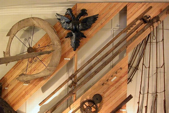 Переславль-Залесский. Фрагмент экспозиции в «Ботном доме» в музее-усадьбе «Ботик Петра I». Корабельные снасти, остатки часового механизма и бронзовый орел, украшавшие дворец Петра I. Фото С.А. Фомченковой.