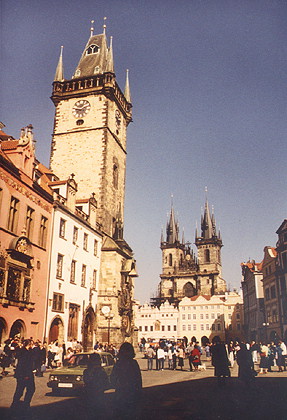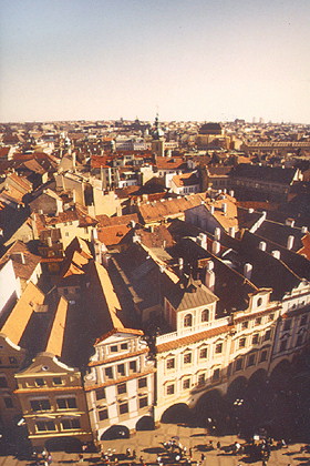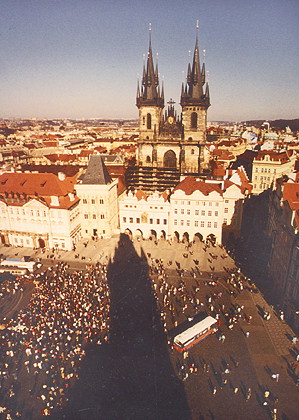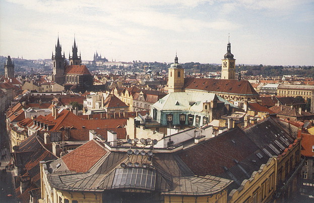 Вид с крыши ратуши на Староместской площади. На заднем плане собор Девы Марии (у Тына).