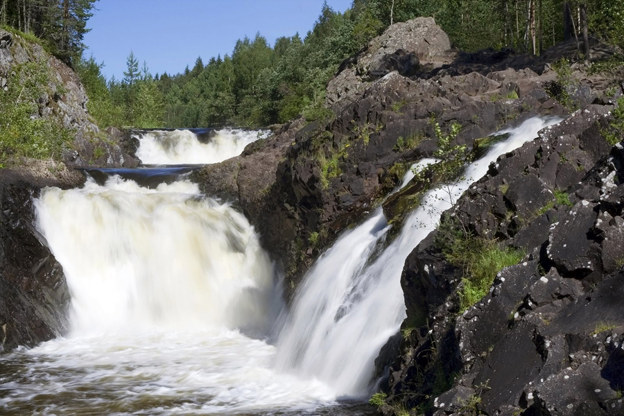Карелия. Водопад Кивач (10, 7 м) на реке Суне. Второй по величине (после Рейнского) равнинный водопад Европы. Расположен в одноименного центре заповедника, в 60 км от Петрозаводска. В 1791 году Г.Р. Державин воспел Кивач в оде «Водопад».