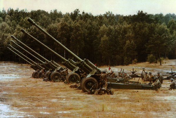 Батарея 130-мм пушек М-46 на огневых позициях. Пушки М-46 были приняты на вооружение Советской Армии в 1951 году.