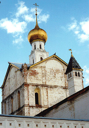 Ростов Великий. Зачатьевский собор Спасо-Яковлевского монастыря. На переднем плане Яковлевская церковь, пристроенная к северному фасаду Зачатьевского собора в 1725 году и перестроенная в 1824 году.