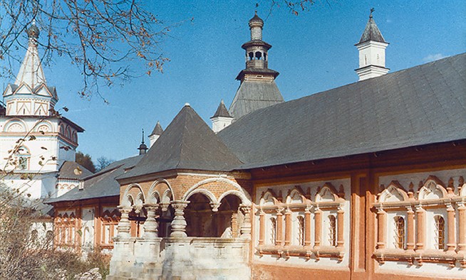 Саввино-Сторожевский монастырь. Красная башня. 1650-е годы. были построены крытые паперти, крыльцо и придел Саввы Сторожевского. Зодчие 17 века выбрали для придела изящную, но устаревшую форму церкви с крещатым сводом, распространенную столетием раньше.