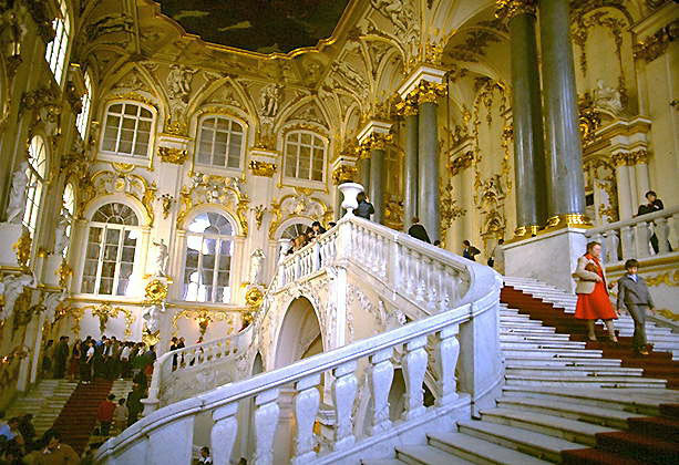 Парадная лестница Эрмитажа. Архитектор В.В. Растрелли. Интерьеры Зимнего дворца перестраивались многократно, особенно после разрушительного пожара в 1837.