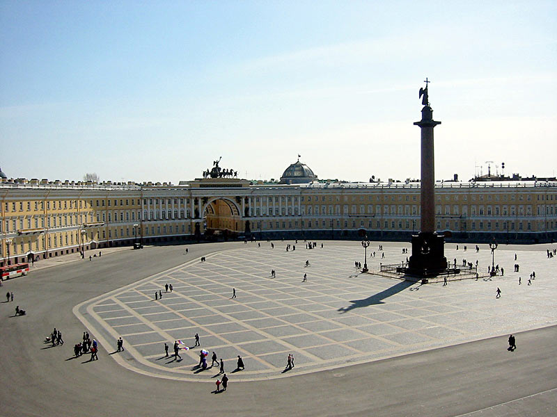 Дворцовая площадь с Александровской колонной и зданием Главного штаба (Санкт-Петербург).Александровская колонна (или «Александрийский столп») — памятник победы русского народа в Отечественной войне 1812 года — была установлена в 1830-34 (архитектор А. А. Монферран) и названа в честь императора Александра I. Памятник представляет собой монолитную колонну высотой свыше 25, 5 м из красного гранита, установленную на постамент, украшенный бронзовыми барельефами аллегорического содержания. Венчает колонну бронзовая фигура ангела, его лицу приданы черты Александра I (скульптор Б. И. Орловский). Ангел попирает крестом змею — символ победы добра над злом.