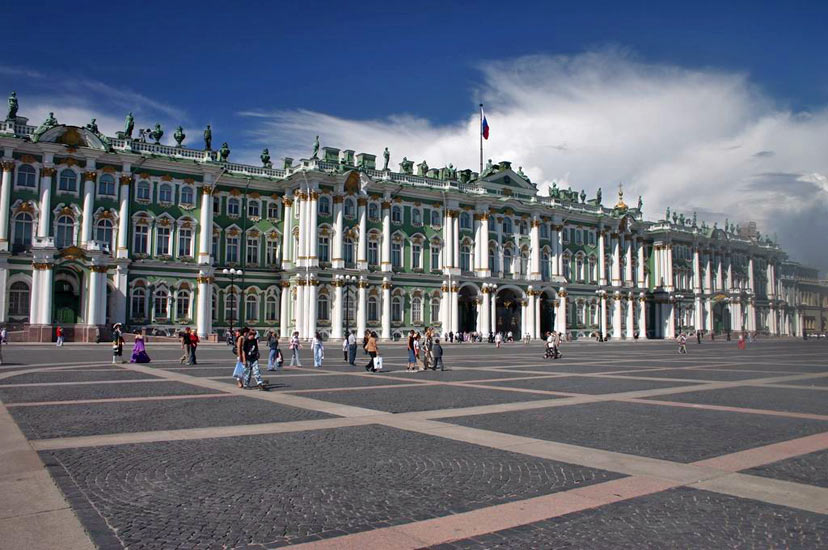 Зимний дворец (вид с Дворцовой площади). Памятник архитектуры русского барокко, до 1905 главная резиденция российских императоров. Архитектор Б. К. Растрелли. 1754-62