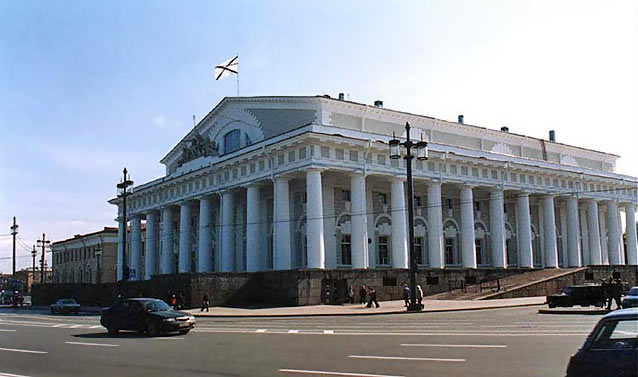 Здание биржи на стрелке Васильевского острова. С 1939 — Военно-морской музей. Памятник архитектуры классицизма. 1805-10. Архитектор Ж. Тома де Томон.