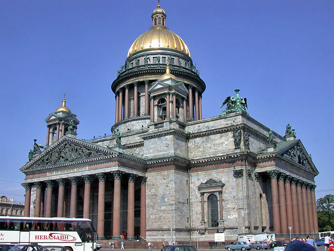 Исакиевский собор. Исаакиевская площадь была спланирована в 1760-х годах. В 1768-1802 был сооружен первый Исаакиевский собор (архитекторы А. Ринальди, В. Ф. Бренна), ныне существующий собор был построен в 1818-58 (архитектор А. А. Монферран).