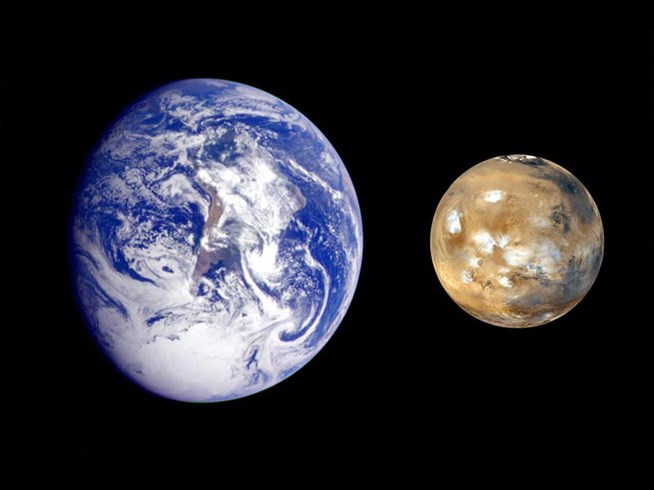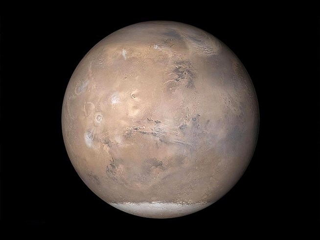 Красноватый оттенок Марсу придают примеси железа, содержащиеся на поверхности планеты.