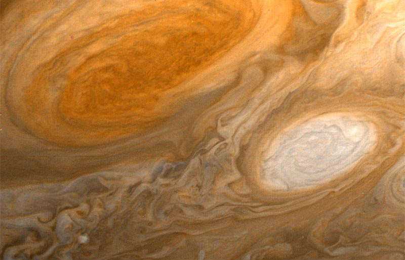 Большое красное пятно и белый овал в атмосфере Юпитера.