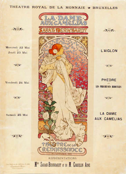 А. Муха. Афиша к спектаклю с участием Сары Бернар «Дама с камелиями». Драма А. Дюма-сына. Театр «Ренессанс», Париж, 1890-е гг.