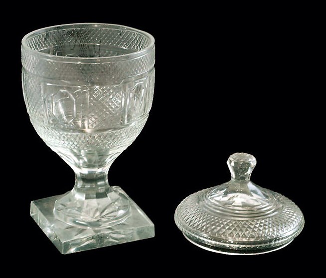 Ваза с крышкой, принадлежавшая М.И. Глинке. В 1915 была подарена племянником композитора А.И Измайловым Ф.И. Шаляпину в честь 25-летия его творческой деятельности. Бесцветный хрусталь, грань. Россия, первая пол. 19 в.