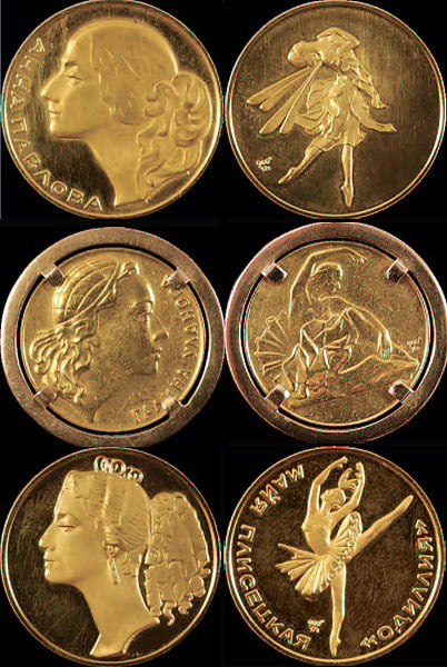 Серия медалей, посвященных русским балеринам: А. Павловой, Г. Улановой, М. Плесецкой. Скульптор Е.Н. Янсон-Манизер. Золото. Россия-Франция, 1964.