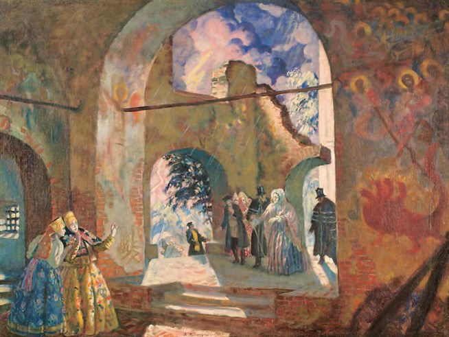 Б. Кустодиев «В церкви». Эскиз декорации четвертого действия к драме А.Н. Островского «Гроза». Неосуществленная поставновка, 1918.