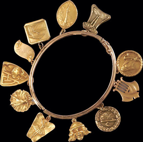 Браслет балерины Большого театра М.А. Другашевой. К браслету прикреплены 11 подвесок с жетонами, подаренными балерине А.А. Бахрушиным в 1901-1910 гг. Аналогичные жетоны Бахрушин дарил в день ежегодного бенефиса в пользу артисток кордебалета Большого театра каждой танцовщице, принимавшей участие в представлении.