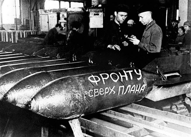 Авиабомбы, выпущенные сверх плана, в цехе оборонного завода. Сибирь. 1942 год.