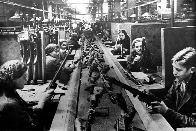 Московский автозавод имени Сталина в годы войны. Конвейер сборки оружия.