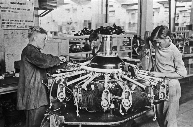 Сборка авиамотора для боевого самолета. Пермский моторостроительный завод. 1943 год [Тыл фронту]