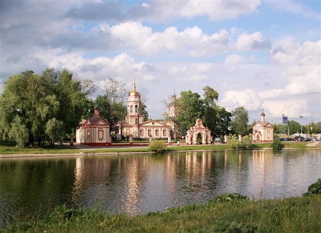 Вид на храмовый комплекс с Храмом Троицы Живоначальной на Борисовских прудах (2001-2004 г.г.). Москва. 2012 год. Фото Сергея Покладова