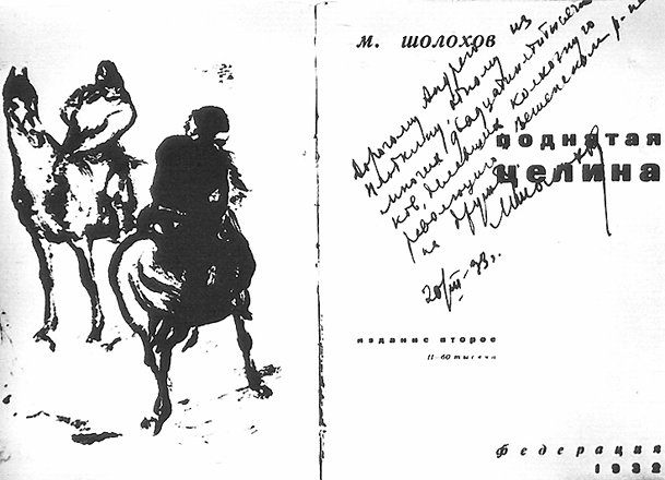 Титульный лист романа М.А. Шолохова «Поднятая целина» с дарственной надписью Андрею Плоткину — прообразу Давыдова.