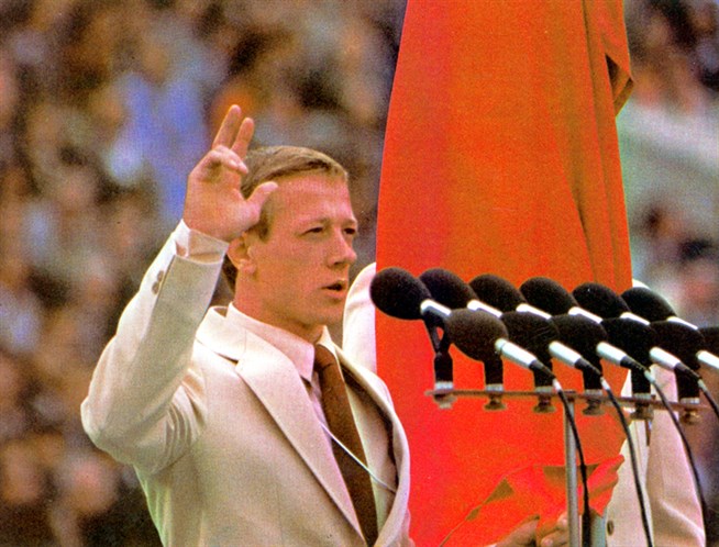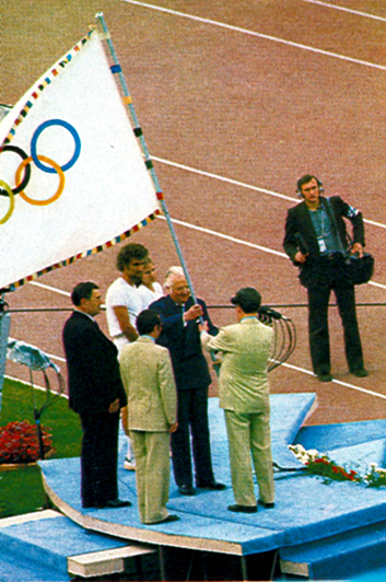 Вынос олимпийского флага на торжественной церемонии открытия Игр XXII Олимпиады. Центральный стадион имени В.И. Ленина 19 июля 1980 года. Россия, Москва. Фото: Сергей Гунеев, архив РИА Новости