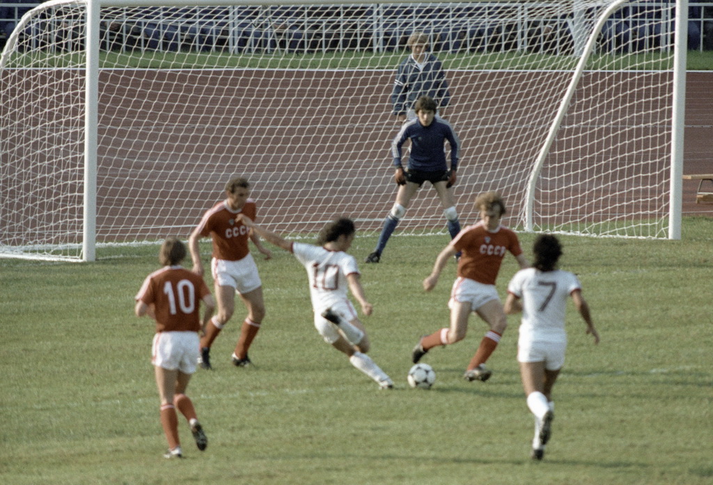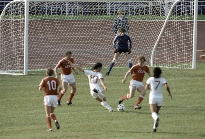 Футболисты сборных команд СССР и Венесуэлы во время матча на XXII Олимпийских играх в Москве. В воротах Ринат Дасаев (сборная команда СССР). Фото: Александр Макаров, архив РИА Новости