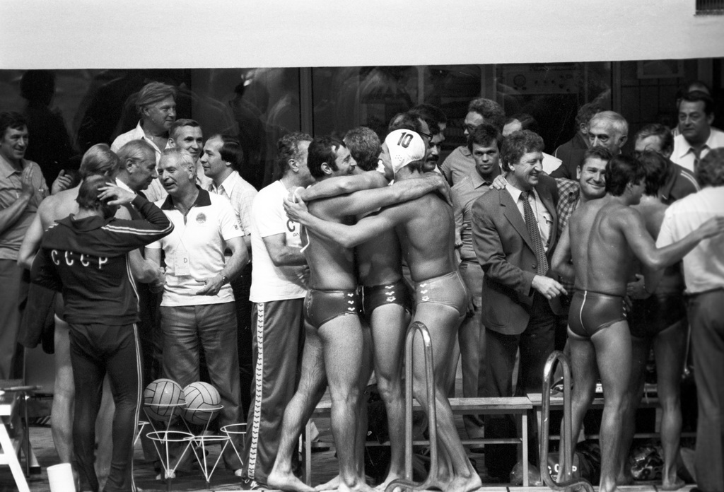 Болельщики поздравляют сборную СССР с победой после матча по водному поло между сборными командами СССР и Югославии. Летние XXII Олимпийские игры 1980 года в Москве. Фото: Александр Макаров, архив РИА Новости