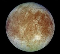 Евро́па (латинское название Europa), спутник Юпитера, среднее расстояние до планеты 599, 6 тыс. км, эксцентриситет орбиты 0, 0094, период обращения вокруг планеты 3 сут 13 ч 13 мин. Из-за сильного приливного действия Юпитера Европа повернута к планете всегда одной стороной. Экваториальный диаметр 3122 км; шестой по величине спутник Солнечной системы, превосходит по размерам карликовые планеты — Цереру, Плутон и Ириду. Масса 4, 8х1022 кг. В центре Европы находится металлическое ядро, окруженное силикатной мантией и панцирем из водяного льда. Поверхность Европы испещрена сетью светлых и темных линий — трещин в ледяной коре. Перепады высот на спутнике не превышают нескольких сотен метров, что объясняется наличием под корой водного океана, по поверхности которого постоянно дрейфуют огромные льдины. Европа имеет разреженную атмосферу, состоящую преимущественно из кислорода.