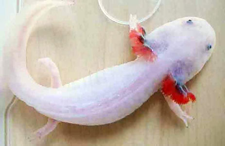В аквариумах содержат выведенных в неволе альбиносов с молочно-белым цветом кожи и красными от просвечивающихся сосудов наружными жабрами.