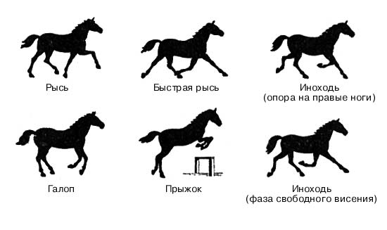 Некоторые естественные аллюры: рысь – лошадь переставляет одновременно две ноги по диагонали; быстрая (размашистая) рысь – лошадь ставит задние ноги впереди следов соответствующих передних; иноходь – лошадь поднимает и опускает то обе левые, то обе правые ноги; галоп – лошадь совершает скачкообразные движение; прыжок – отталкивание вперед одновременно обеими задними ногами.
