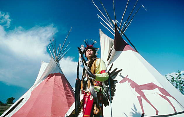 Индеец апачи в традиционном костюме возле вигвамов.