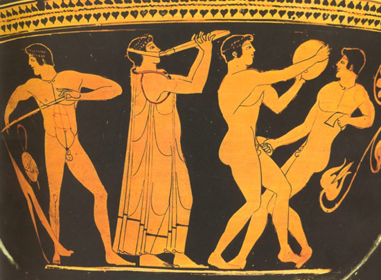 Тренировка атлетов под аккомпанемент флейтиста. Рисунок на краснофигурном кратере. Ок. 480 до н. э. Копенгаген, Национальный музей.