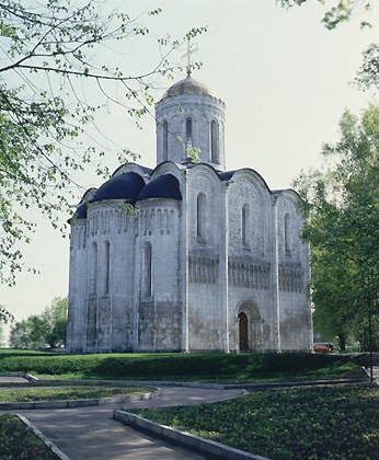 Дмитриевский собор (Владимир) был построен при великом князе Всеволоде Большое Гнездо (1194-1197) как главный княжеский храм. Он носит имя «небесного покровитеся» Всеволода — Димитрия Солунского. Современный вид собора значительно отличается от первоначального. Одноглавый четырехстолпный храм был окружен низкими крытыми галереями, у западных углов имел лестничные башни со всходами на хоры и, примыкая к княжескому дворцу, соединялся с ним переходом. Башни и галереи были разобраны в 19 в. По стенам и апсидам собора идет затейливый аркатурно-колончатый пояс, стены украшены изящной белокаменной резьбой с изображениями растений и животных. Арочный фриз включает рельефные человеческие фигуры, самыми древними из которых являются фигуры в западной части северного фриза (остальные были выполнены в 19 в.). С южной стороны фасада (с этой стороны князья входили в храм) помещен рельеф царя Соломона, сидящего на своем знаменитом троне в виде фигур львов. В аркатурном фризе южного фасада находились и фигуры русских князей, в том числе и владимирских. На северном фасаде представлен сам Всеволод III с сыновьями. Центральной фигурой всех трех фасадов является царь Давид. Сохранились фрагменты уникальной фресковой росписи 12 в.