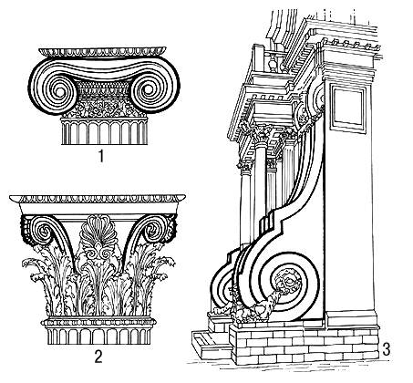 Волюты: 1 — ионической капители; 2 — коринфской капители; 3 — портала.