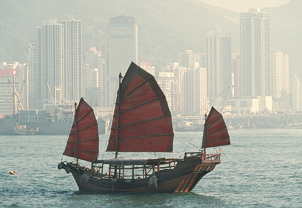 Джонка в водах пролива Вэйдолияган. На заднем плане: Гонконг (Сянган).