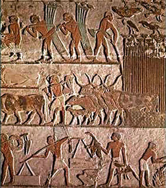 С помощью рельефных и фресковых композиций декорировались внутренние и внешние стены заупокойных храмов, обелиски и стелы. Обычно они раскрашивались в цвета, имеющие символический смысл. Иногда в рельефах и фресках представлены вполне конкретные сцены из повседневной трудовой жизни египтян: охота в нильских зарослях, рыбная ловля, трапеза. Фреска с изображением трудовой жизни египтян. 2 тыс. до н. э. Лувр, Париж.