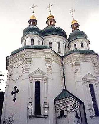 Киев. Георгиевский собор (1696-1701) Выдубицкого монастыря. Каменный крестчатый в плане, пятиглавый храм. Состоит из пяти крестообразно поставленных граненых башен. Их грани декорированы неширокими пилястрами с капителями. Высоко под карнизом помещены лепные фигурные щиты с гербом полковника М. Миклашевского, на средства которого построен собор.