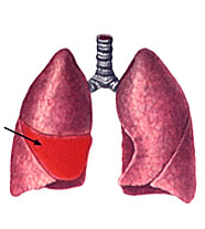 Крупозная пневмония: участок воспаления в легком (средняя доля правого легкого).