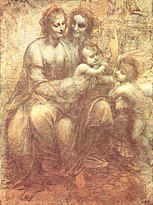 Леонардо да Винчи. «Святая Анна с Марией, младенцем Христом и Иоанном Крестителем» (красноватая бумага, наклеенная на холст; уголь; белила). Национальная галерея, Лондон.