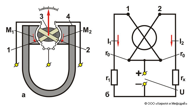 Устройство магнитоэлектрического логометра (а) и схема омметра с магнитоэлектрическим логометром (б): M1, M2 — вращающие моменты; l1, I2 — токи в цепях омметра; U — источник питания; r0 — сопротивление рамок логометра; r1 — омическое сопротивление; rх — измеряемое сопротивление; 1, 2 — рамки логометра; 3 — сердечник; 4 — постоянный магнит.