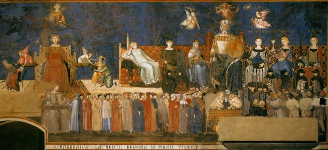 Амброджо Лоренцетти. Аллегория Доброго правления. 1337-1339 годы. Фреска Зала Советов в Палаццо Публико, Сиена. Символ Доброго правления представлен в виде мужчины на троне, одетого в одежды белого и черного цветов — цветов Сиены. У подножия трона — близнецы Сений и Асканий, сосущие молоко у волчицы. Женщина на троне — Правосудие, фигуры в верхнем регистре — символы добродетелей. Внизу — представители Сиенской коммуны.