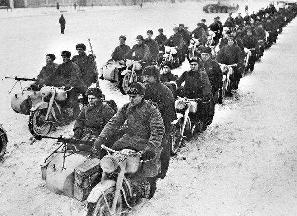 Колонна мотоциклистов батальона особого назначения отправляется на фронт. Москва. 1941 год.